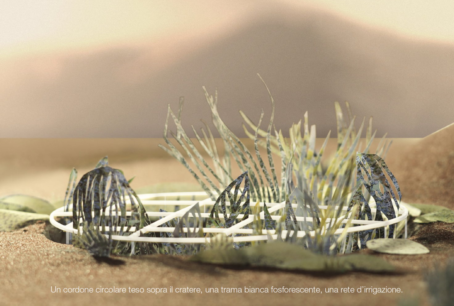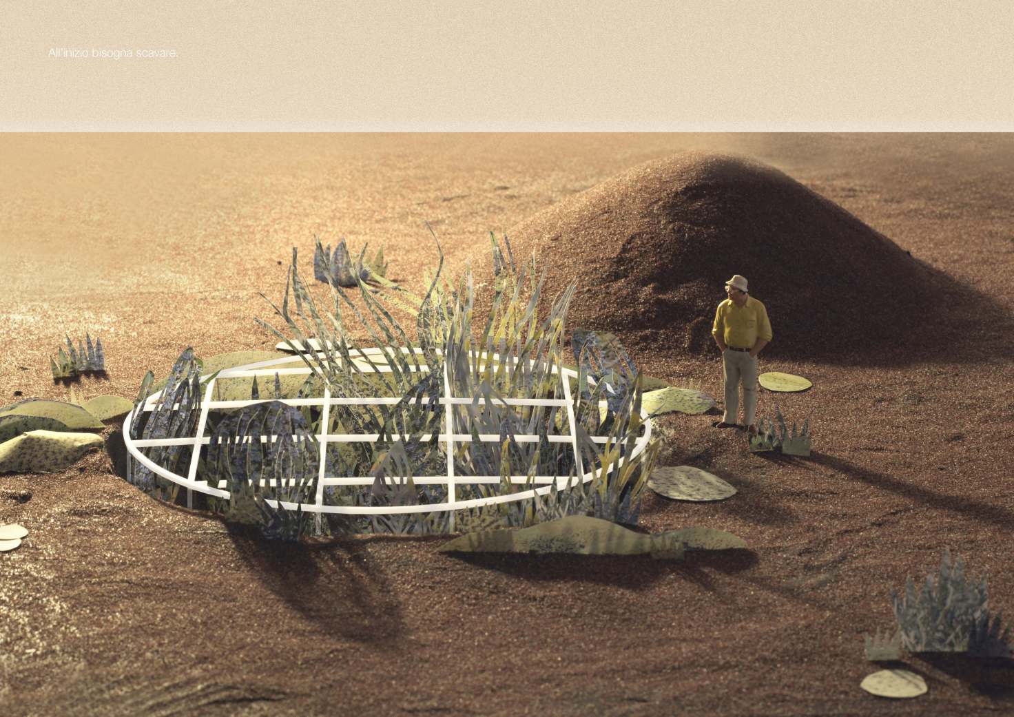 Nous fouillons dans les formes vernaculaires, Le dammuso, l’habitat monticule et son jardin frais. Microclimat, système écologique autonome, Nous cherchons l’eau et nous protégeons du vent, Le travail quotidien de la terre en mouvement. Nous creusons le terreau fertile de l’Etna, Et ses strates géologiques, Pour y planter végétations rases, herbacées et arbustives Communion de la flore endémique catanaise, Et de la sélection horticole de Piante Faro.