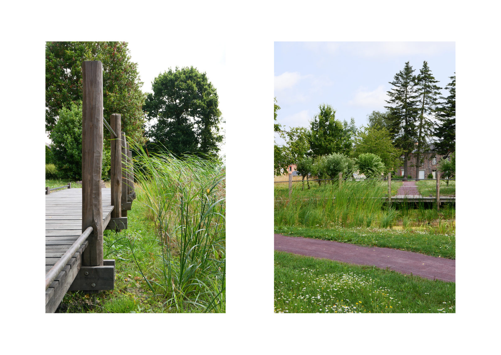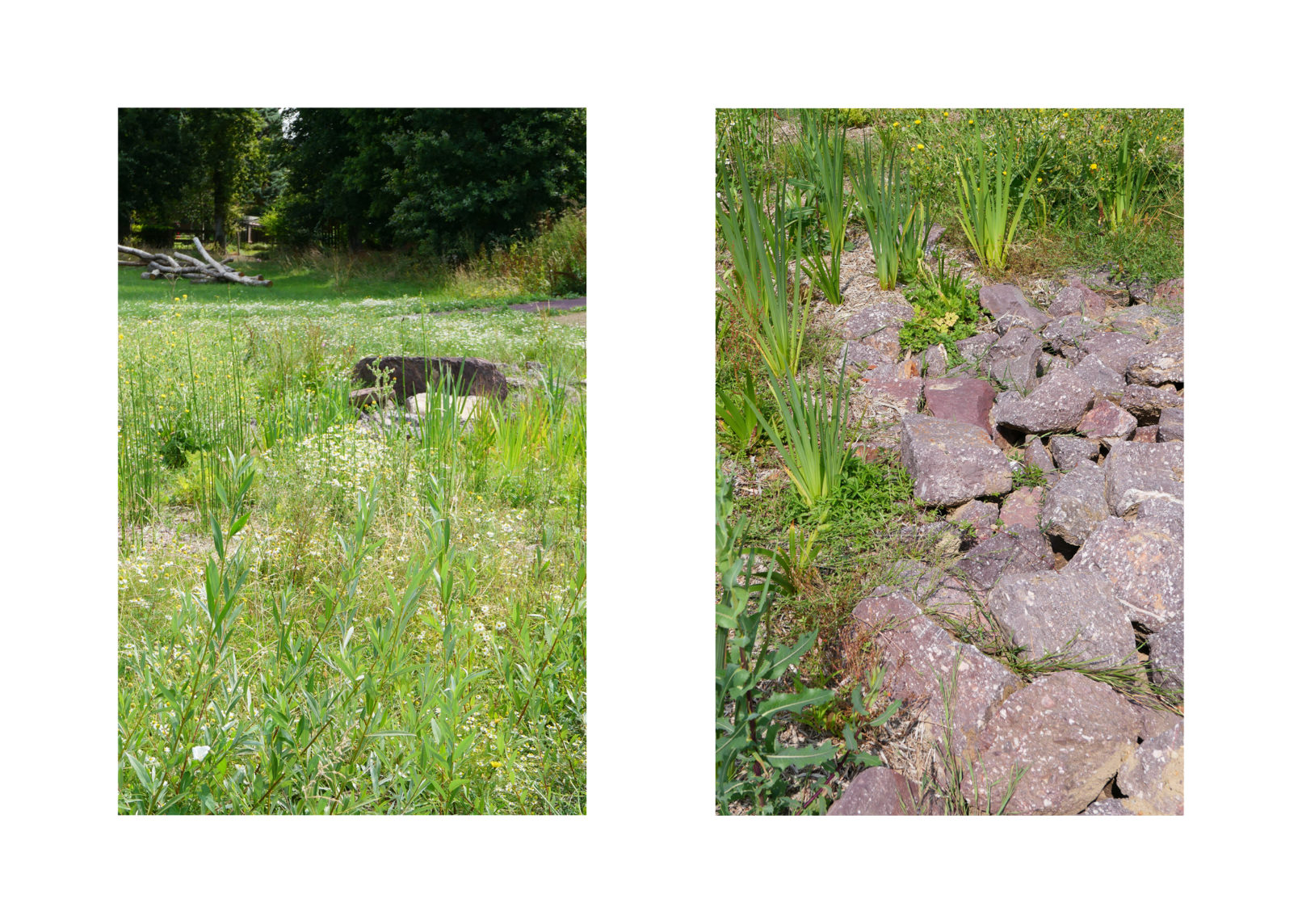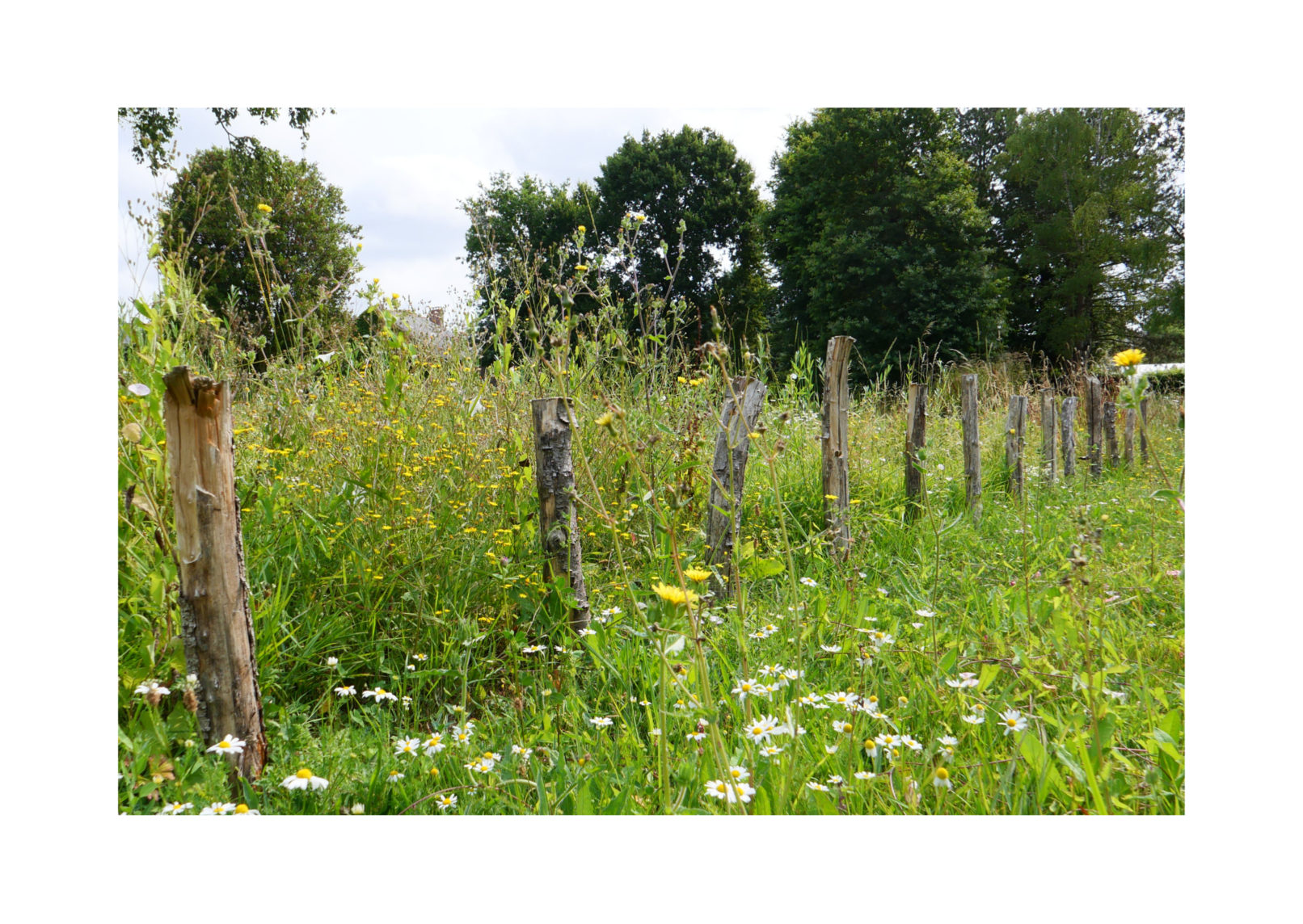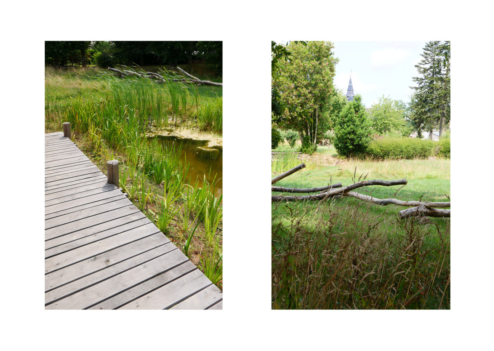 Les Jardins du Presbytère ont été réalisés entre septembre 2022 et avril 2023. Ils reflètent les préoccupations contemporaines : la recherche d’un juste compromis entre la maîtrise et le spontanée. Ils ne sont ni figés ni taillés au cordeau, c’est un milieu en mouvement que l’on accompagne au cours de son évolution. Respecter l’existant et le déjà-là, intervenir sobrement pour dessiner un paysage et favoriser des usages, se préoccuper de la provenance et de la mise en oeuvre des matériaux, proposer un autre regard sur le vivant, jouer avec les formes d’expression naturelle d’un écosystème de la prairie aux fourrés et des fourrés au bois, sont autant de principes qui ont été au centre de la conception des Jardins du Presbytère. Ce jardin en coeur de bourg est à la fois une place publique et un jardin sauvage. Deux axes connectent le patrimoine bâti et les milieux naturels. Le premier relie le clocher de l’église et le cercle de pierres (à l’est du jardin) ; le second raccorde l’ancien Presbytère et le ponton (au sud du jardin). L’ancien verger du Presbytère a été agrandi. Il y pousse 14 variétés de pommiers, poiriers, pruniers et cerisiers. En contre bas de la parcelle, se déploie la zone humide. Ici, se côtoient prairies naturelles et prairies fleuries ; plantes aquatiques, semi-aquatiques et hélophyptes, autour et dans la mare ; des haies de saules et, bientôt, des bosquets en libre évolution.