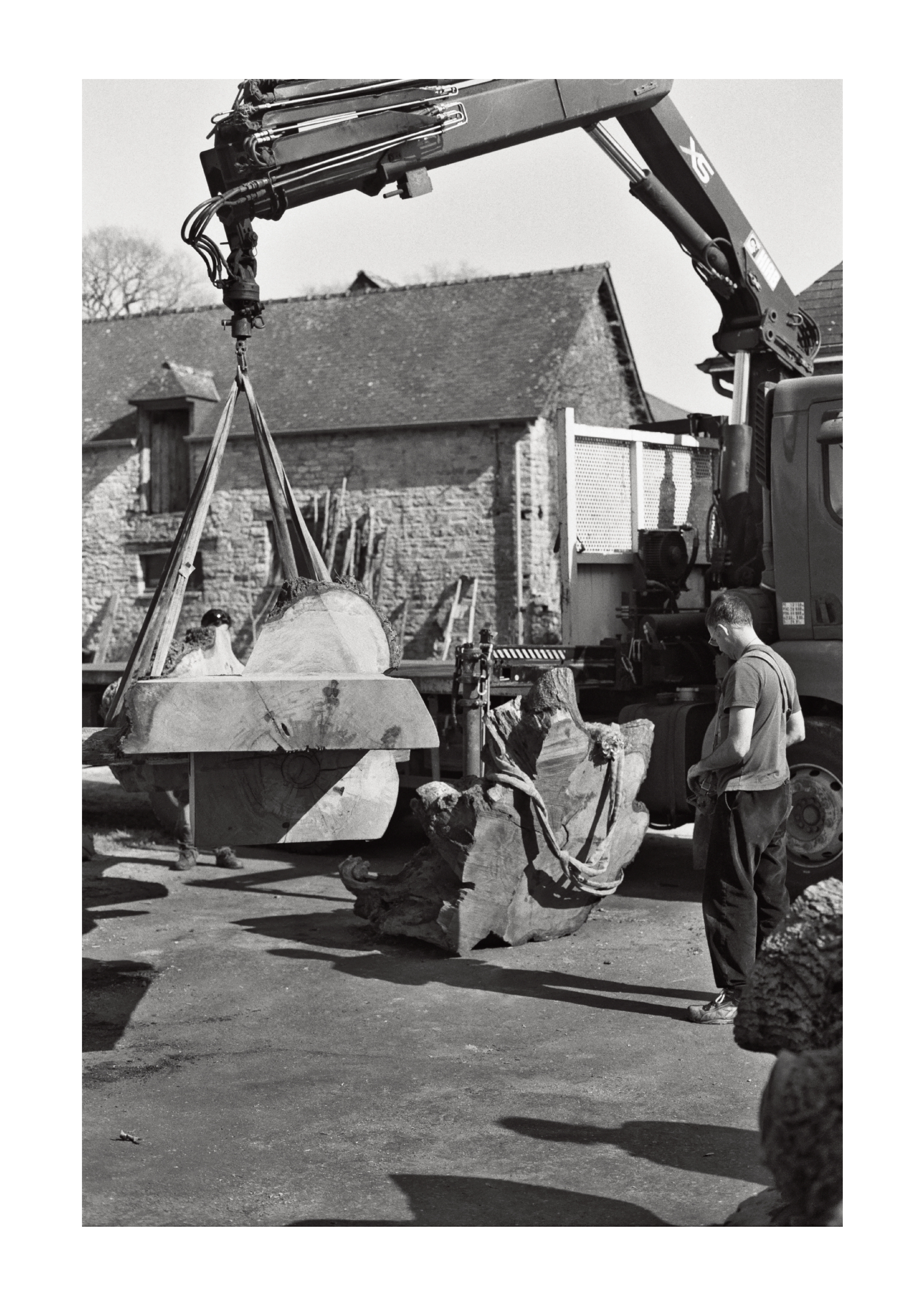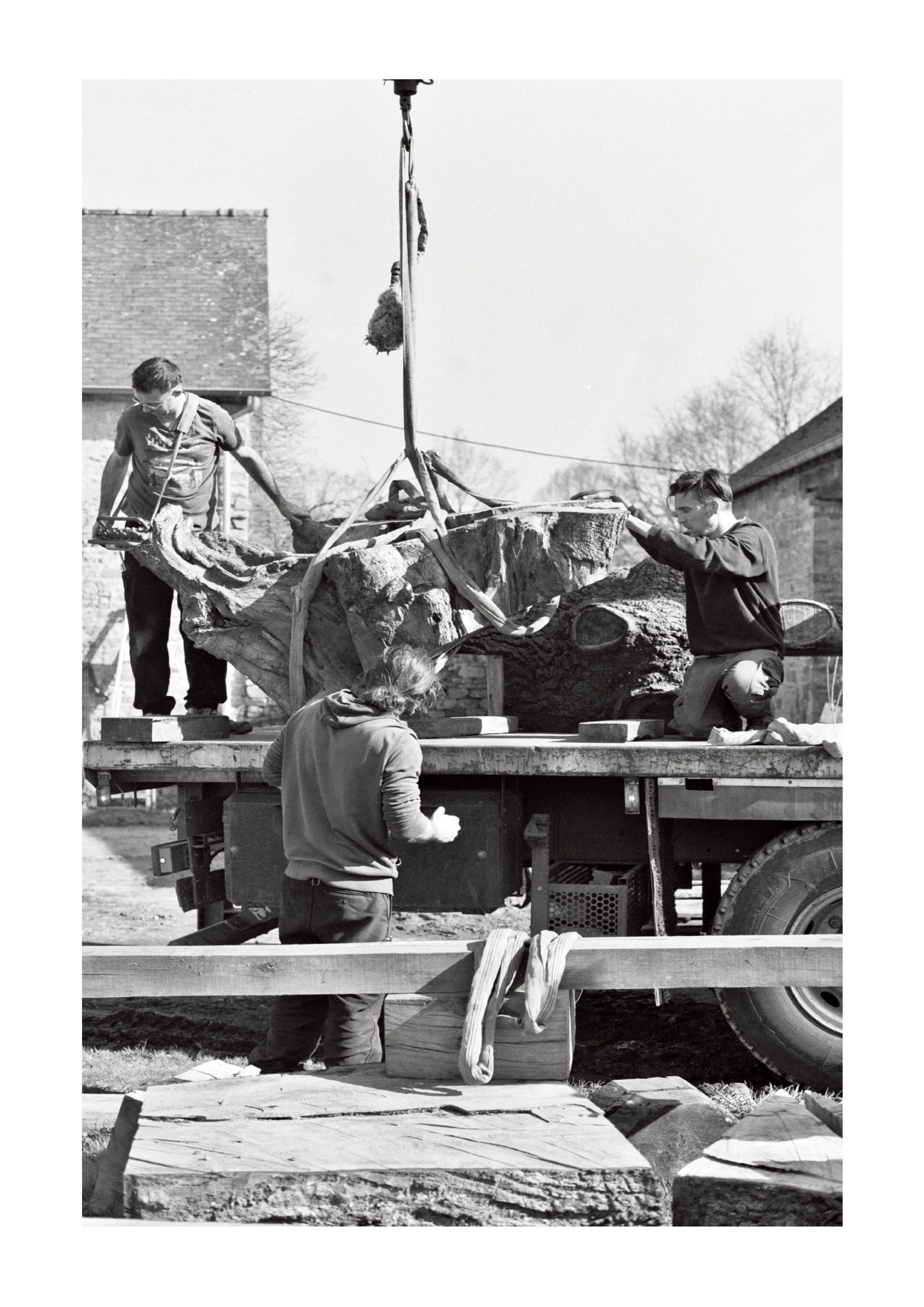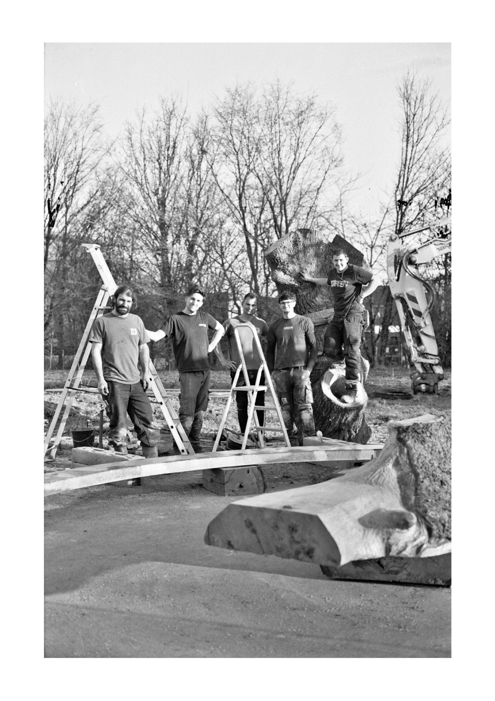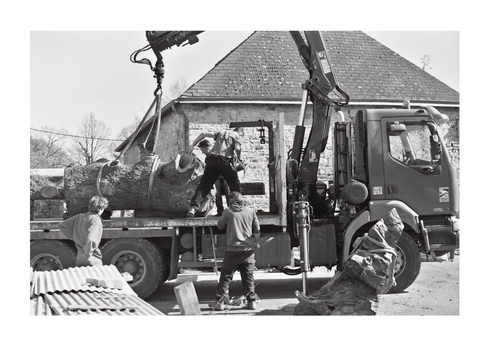 Désespéré.e.s, les humains, les humaines ainsi que les enfants décident, dans un dernier geste, de rendre un dernier hommage, au dernier géant, de l’embaumer et de lui offrir la plus belle veillée funèbre jamais imaginée, en puisant dans leur dernières ressources. Pendant plusieurs semaines, mois, années, sans relâche, ielles se relaient nuit et jour pour sculpter, creuser, façonner sa dépouille. Les copeaux volent sous les coups des haches, des cognées. Les veines du bois éclatent au passage des rabots et des racloirs. Les formes des noeuds sont sublimés par les gouges, des plans apparaissent dans le duramen. Une partie du tronc est dressée, l’autre couchée, la souche est nettoyée, brossée. Ielles s’appliquent, encore et encore, les yeux toujours emplis de larmes sans relever la tête de leur ouvrage.