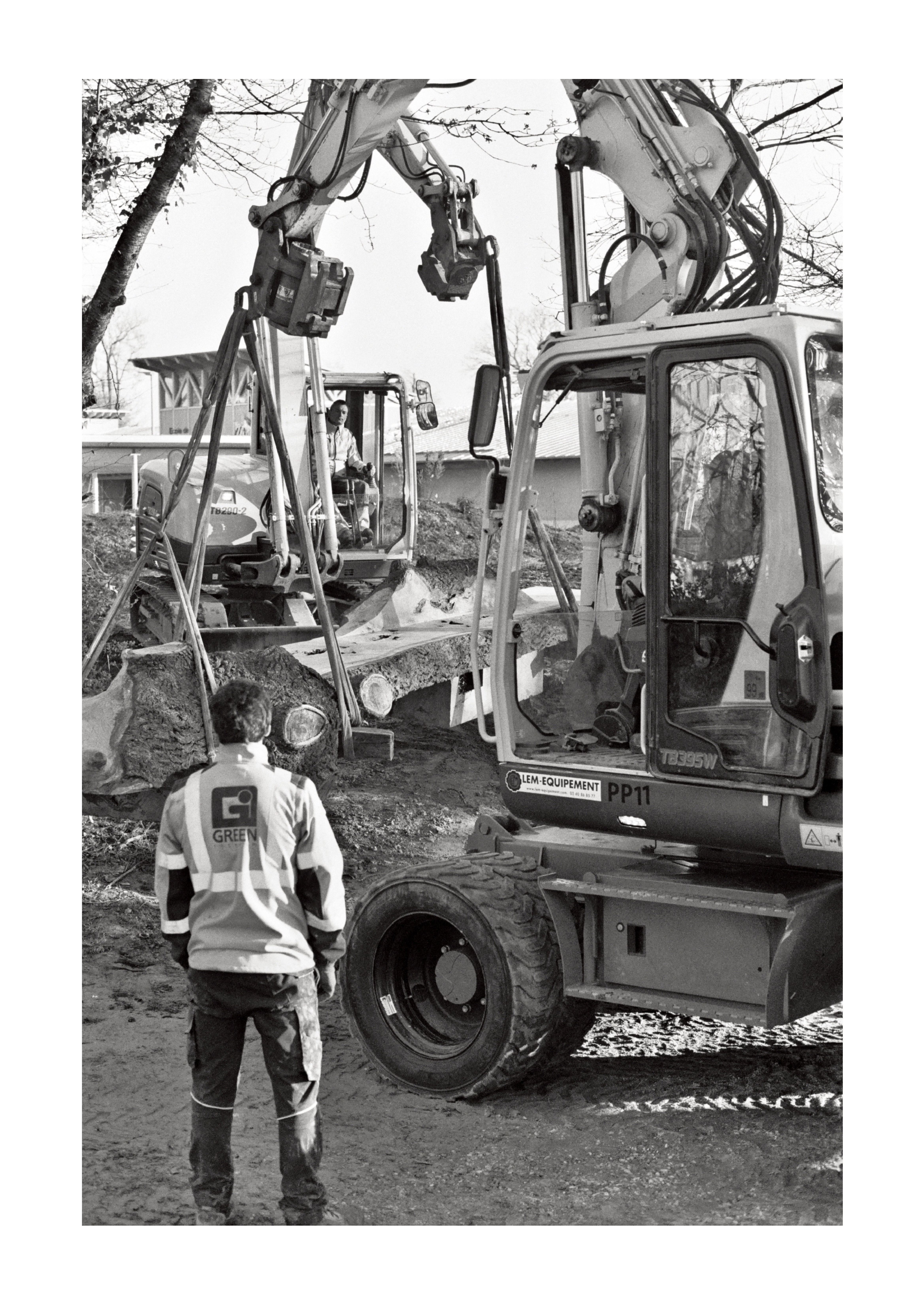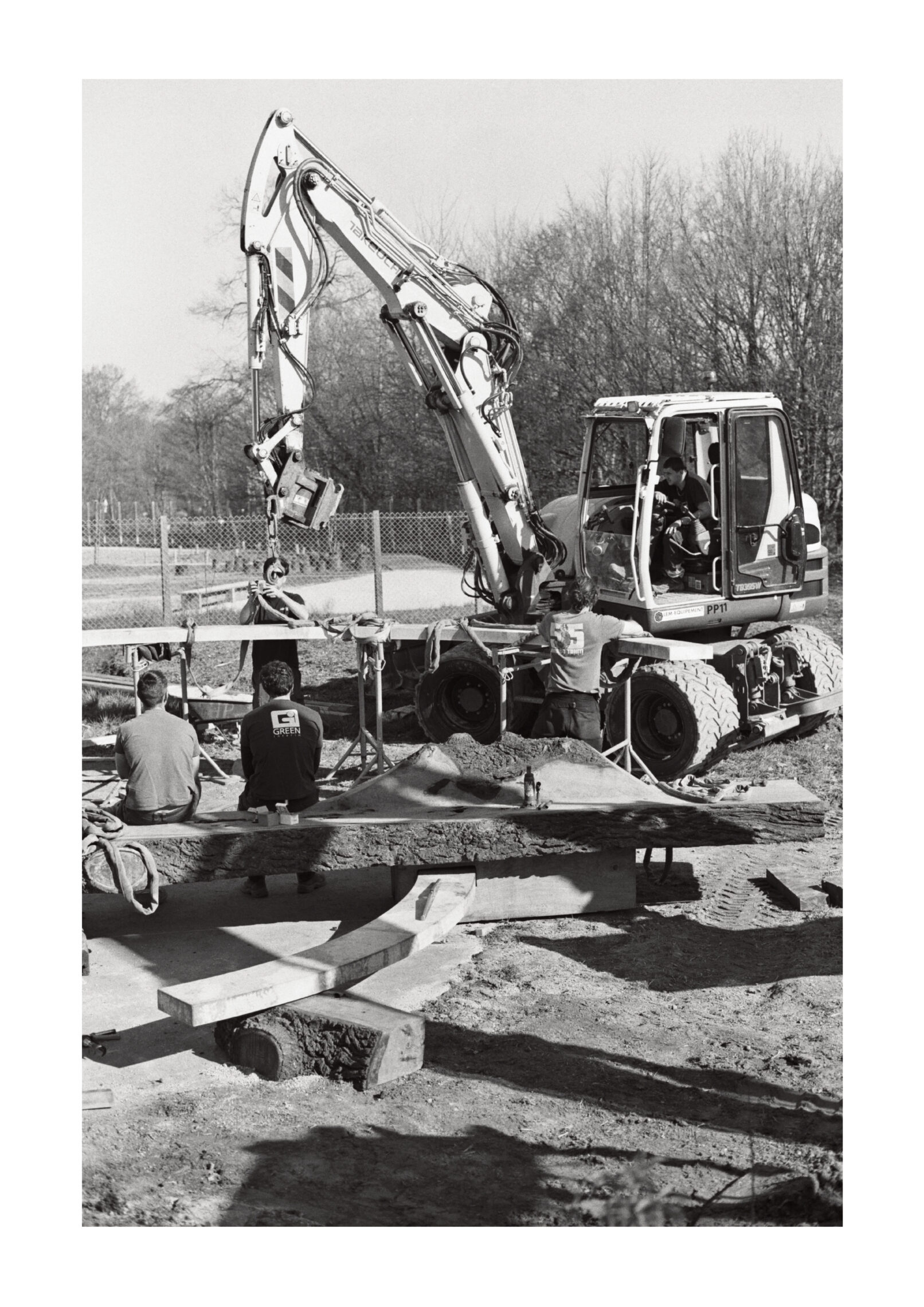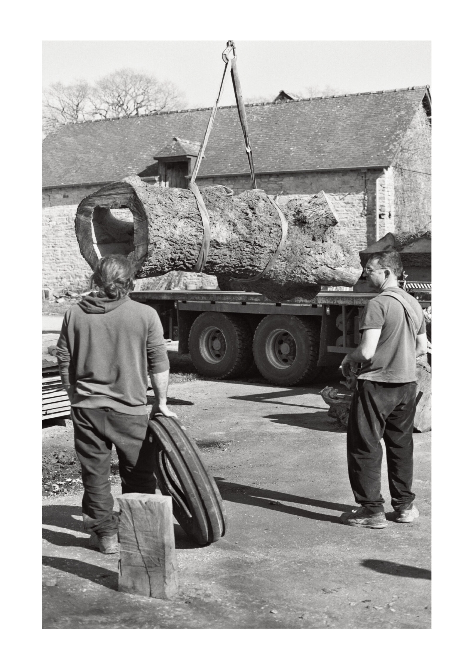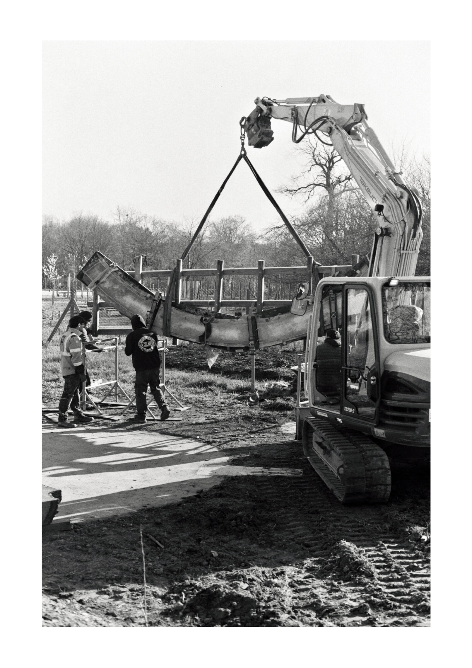 Désespéré.e.s, les humains, les humaines ainsi que les enfants décident, dans un dernier geste, de rendre un dernier hommage, au dernier géant, de l’embaumer et de lui offrir la plus belle veillée funèbre jamais imaginée, en puisant dans leur dernières ressources. Pendant plusieurs semaines, mois, années, sans relâche, ielles se relaient nuit et jour pour sculpter, creuser, façonner sa dépouille. Les copeaux volent sous les coups des haches, des cognées. Les veines du bois éclatent au passage des rabots et des racloirs. Les formes des noeuds sont sublimés par les gouges, des plans apparaissent dans le duramen. Une partie du tronc est dressée, l’autre couchée, la souche est nettoyée, brossée. Ielles s’appliquent, encore et encore, les yeux toujours emplis de larmes sans relever la tête de leur ouvrage.
