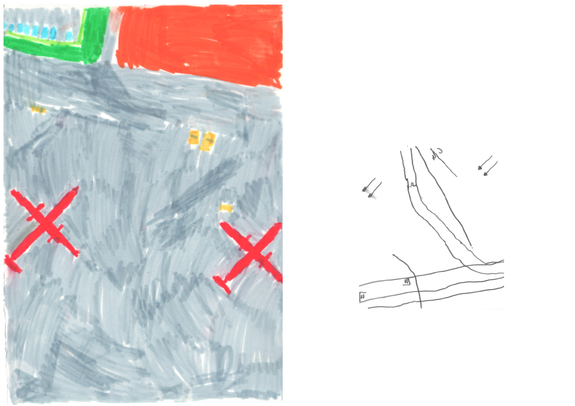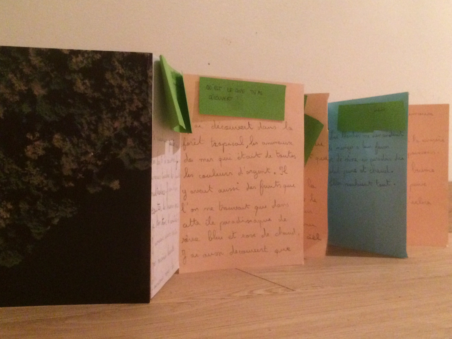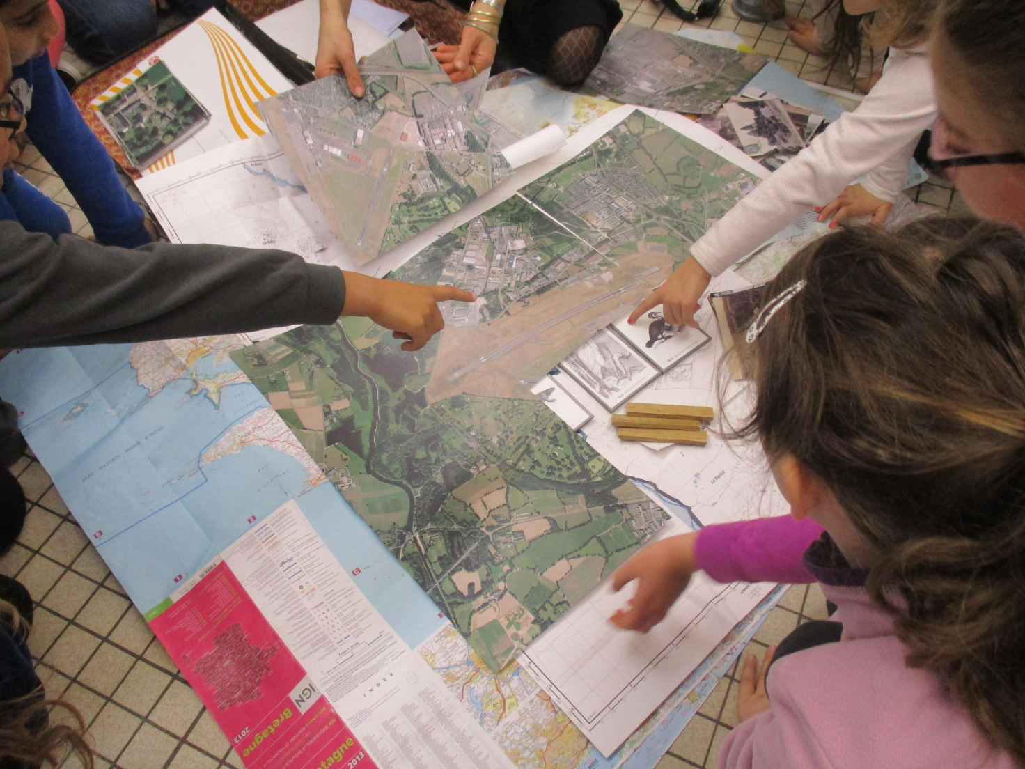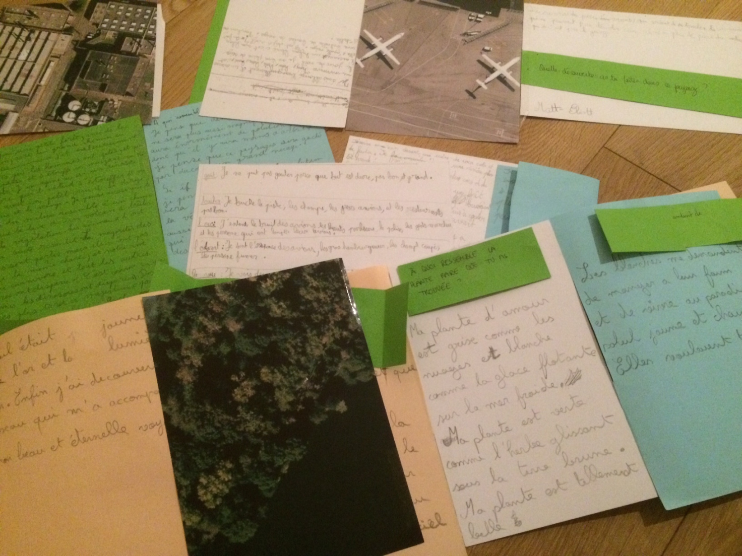 « Je ne peux pas goûter parce que tout est dur, pas bon et grand. Je touche la piste, les champs, les gros avions et les restaurants pas bons. J’entends le bruit des avions, les hauts-parleurs, la police, les gens marcher et les personnes qui ont loupé leur avion. Je sens l’essence des avions, les gros hamburgers, les champs coupés, les personnes fumer. Je vois des avions, des hangars, des champs » Extrait de texte d’Esteban, élève de CM2 à l’école Eugène Pottier de Saint-Jacques-de-la-Lande