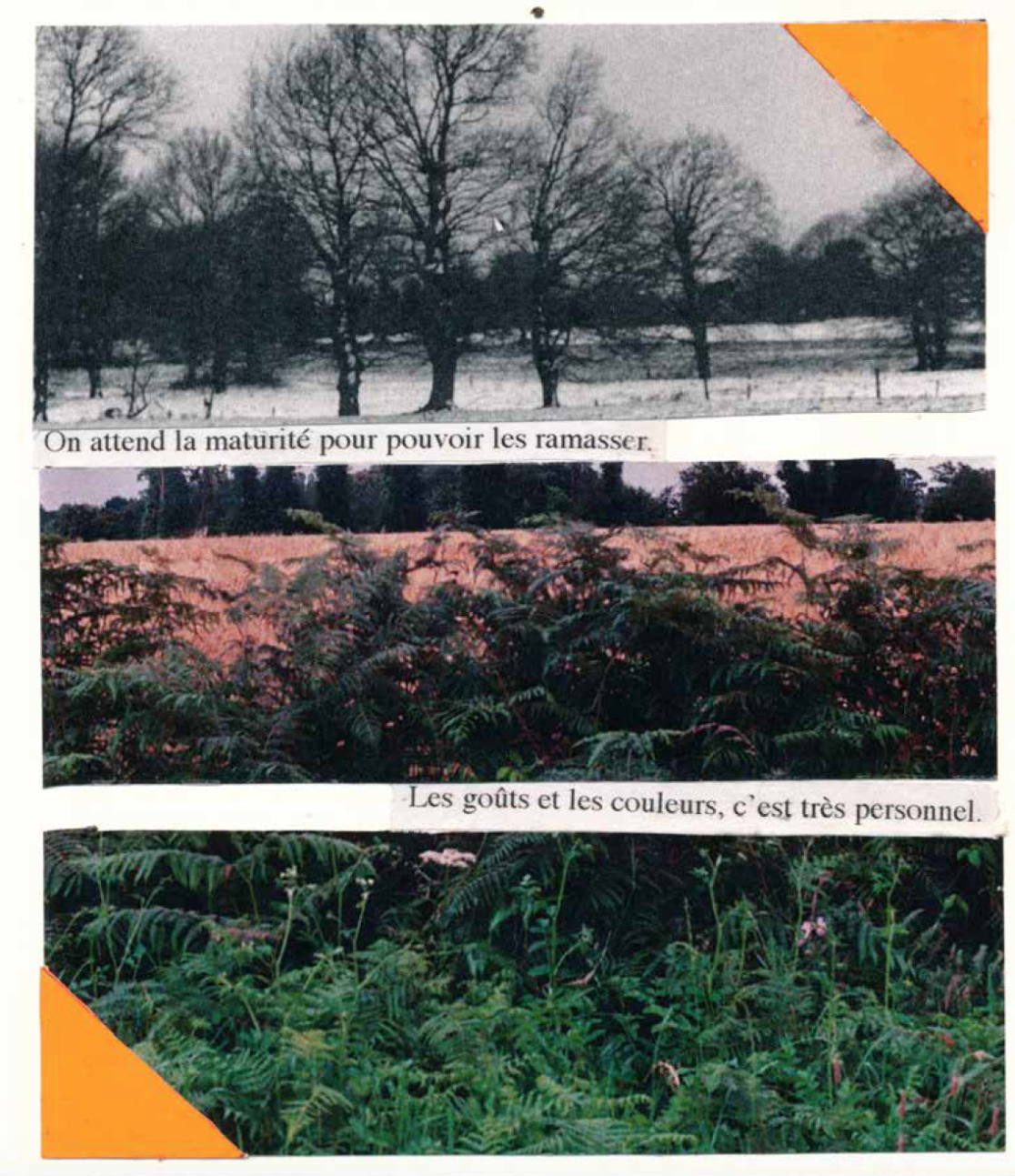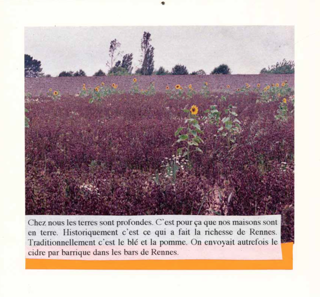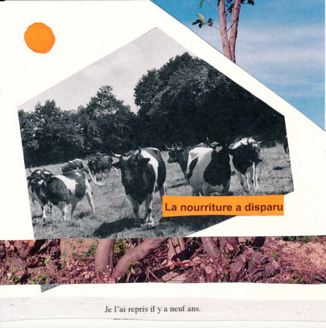 Une collection de matières à disposition : des photographies argentiques de paysages, de pratiques, d’objets, de ressources en noir et blanc et en couleurs, des extraits de textes de fictions, des verbatims d’entretiens avec des agriculteurs et des agricultrices, des consignes graphiques.