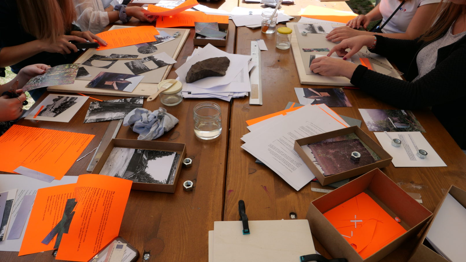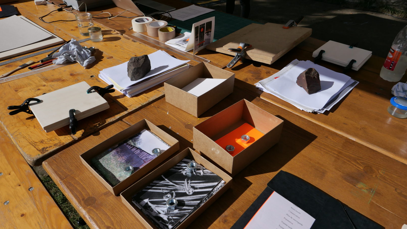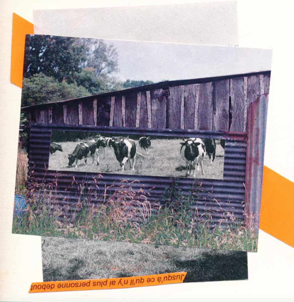 Une collection de matières à disposition : des photographies argentiques de paysages, de pratiques, d’objets, de ressources en noir et blanc et en couleurs, des extraits de textes de fictions, des verbatims d’entretiens avec des agriculteurs et des agricultrices, des consignes graphiques.